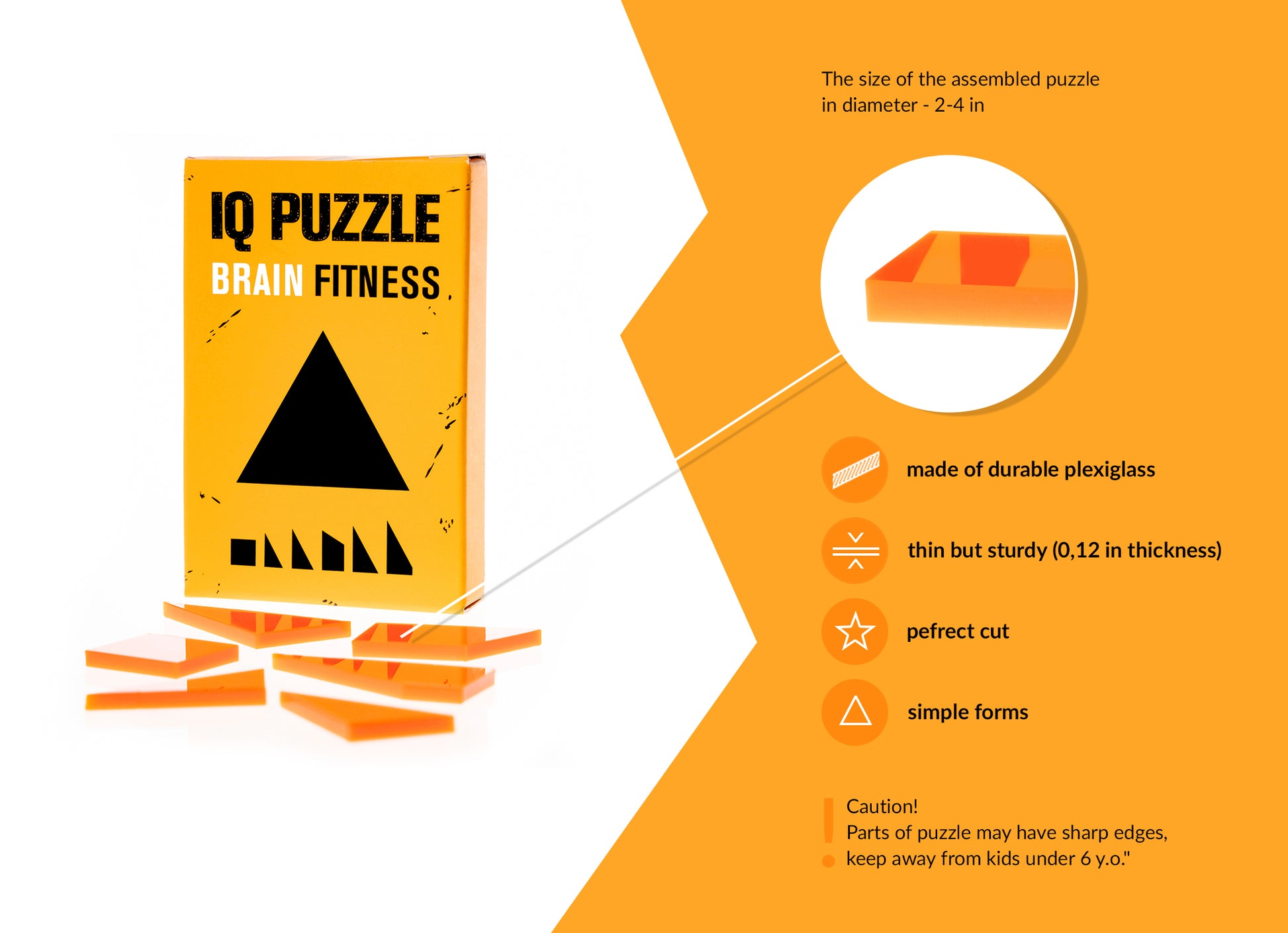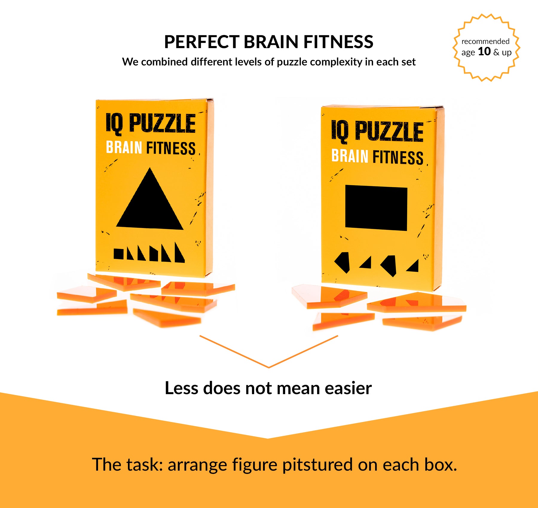 The “IQ Puzzle" Fundamental Geometry set of 3 consists from "Triangle( 6 Pieces)" "Square( 4 Pieces)" "Rectangle( 4 Pieces)". A large number of details is not the main indicator of complexity.You can spend 15 minutes on each of "IQ Puzzle", or you can spend several hours.